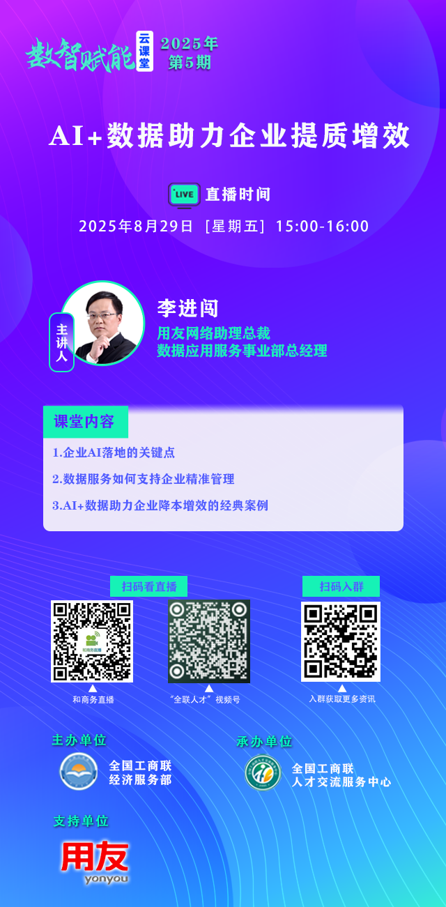 由全国工商联经济服务部主办,全国工商联人才交流服务中心承办的2025年“数智赋能云课堂”第5期将于8月29日15:00-16:00正式开播。
